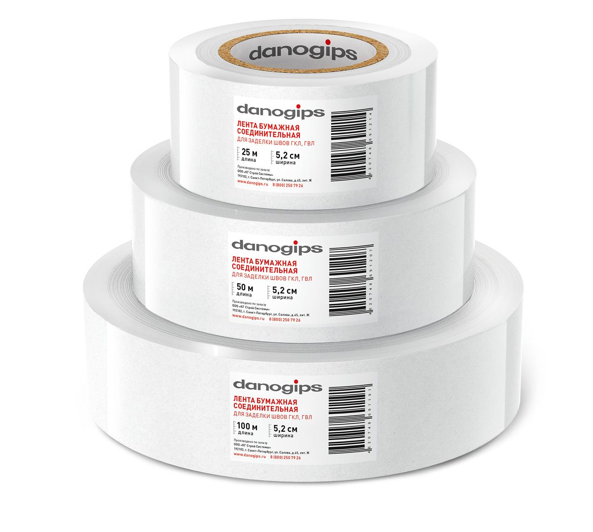 Бумажные соединительные ленты для заделки швов Danogips – прочные волокнистые ленты, предназначенные для применения со шпатлевкой для усиления швов и внутренних углов ГКЛ, ГВЛ.
