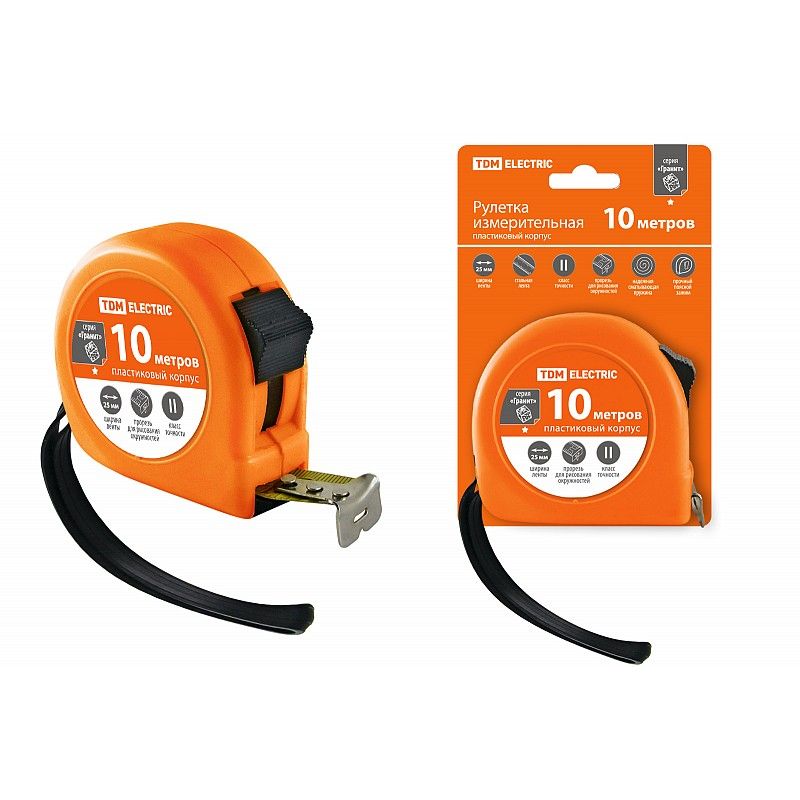Рулетка длина 10м, стальная лента,ширина 25мм,пластиковый корпус «Гранит» TDM