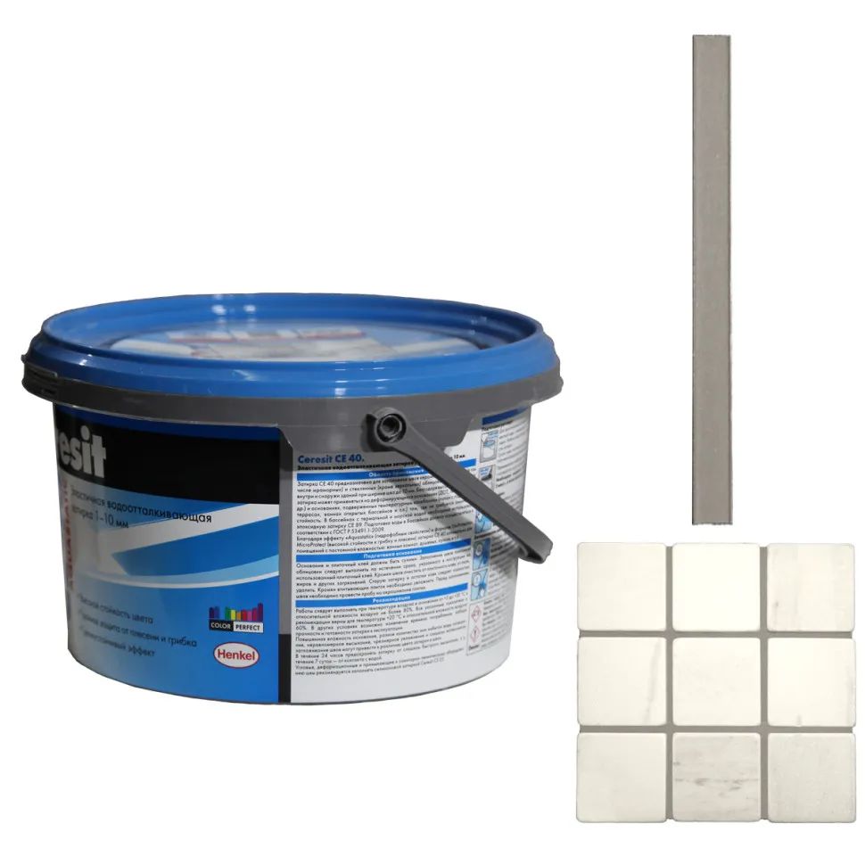 Затирка для плитки Ceresit CE 40 – цветной цементный состав для заполнения плиточных швов. Предназначена для швов от 1 до 10 мм. В состав включены противогрибковые и гидрофобизирующие добавки, обеспечивающие защиту от образования пятен грибка и плесени и водоотталкивающий эффект. Затирка мелкодисперсная, обеспечивает идеально гладкий шов, стойкий к загрязнениям и легко очищаемый. Является эластичной, и может применяться по основаниям, подверженных деформациям - по теплым полам, по гипсокартону, ДСП, в чашах бассейнов (без морской воды), на террасах и балконах и т.п. Оптимальная для применения в помещениях с постоянной влажностью - в кухнях, ванных комнатах, душевых и т.п., также допускается применение при производстве наружных работ (с поправкой на ширину шва - строго до 10 мм). За счет наличия в составе гидрофобизирующих добавок, эту затирку следует готовить с использованием миксера-насадки для перемещивания (не стоит замешивать ее вручную), поскольку только механическое перемешивание обеспечит получение однородной консистенции.